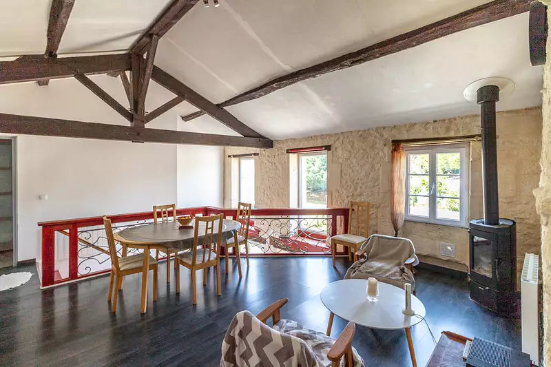 À l’étage, vous apprécierez la vaste pièce de vie de 29 m2 avec un beau plafond cathédrale et des poutres et pierres apparentes.