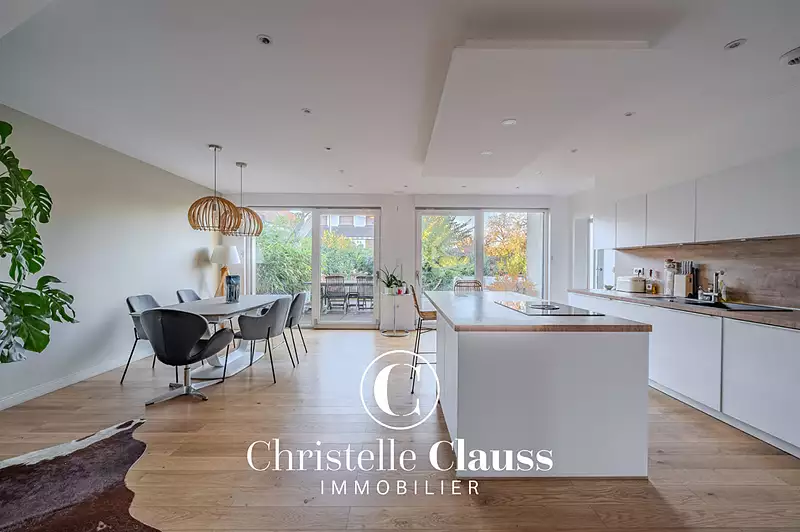ITTENHEIM - KOCHERSBERG Maison contemporaine de 2020 157 m² au sol sur un terrain de 296 m² Prestations haut de gamme DPE A+ Découvrez cette superbe maison accolée construite en 2020, offrant 157 m² au sol et édifiée sur une parcelle de 296 m², située dans un environnement calme, verdoyant et sans vis-à-vis. Grâce à son isolation extérieure et son DPE A+, cette maison bénéficie d'un confort thermique exceptionnel. Elle est équipée d'une pompe à chaleur air/eau couplée à des panneaux solaires, permettant une autonomie énergétique d'environ 7 mois sur 12. Les dépenses énergétiques s'élèvent à environ 1 500 euros / an pour les 5 mois restants, incluant le chauffage de la piscine de mai à septembre. Installation dédiée à la piscine : PAC et tableau électrique spécifique. Extérieur Terrain arboré Terrasse en bois Piscine chauffée Environnement calme et agréable Rez-de-chaussée: Spacieux espace de vie de 73 m² lumineux Cuisine équipée avec électroménager BOSCH Accès direct à la terrasse et à la piscine ainsi qu'au jardin WC avec lave-mains Buanderie Accès au sous-sol. Accès au garage avec porte isolée et motorisée Volets électriques sur l'ensemble de la maison. Système d'alarme. Étage: - 4 chambres, dont une suite parentale avec terrasse privative, salle d'eau, dressing. - Salle de bains complète avec WC, baignoire et douche Informations complémentaires: Taxe foncière : 1 000 euros Redevance ordures ménagères : 600 euros Construction récente Prestations de qualité Maison parfaitement entretenue (5.77 % honoraires TTC à la charge de l'acquéreur.)