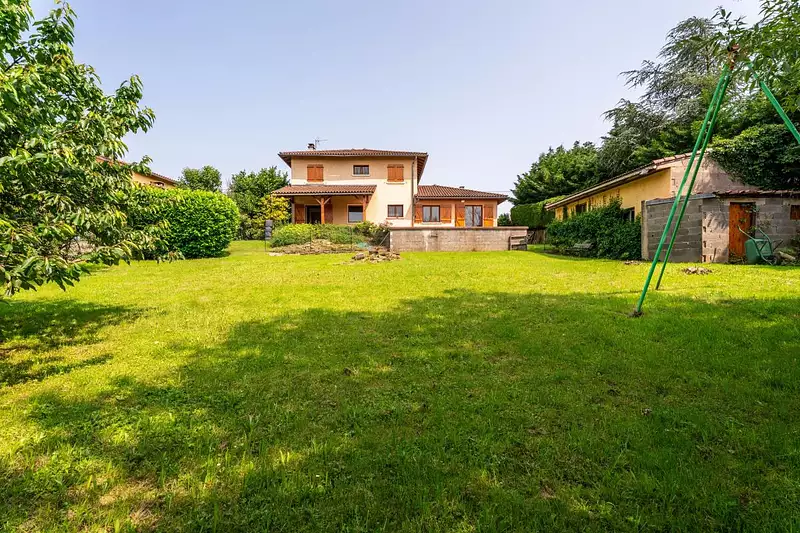 À l'extérieur, le jardin plat et clos, agrémenté d'arbres fruitiers, d'un espace de jeux et de dépendances, offre de multiples possibilités d'aménagement : potager, terrain de loisirs, ou encore projet de piscine. L'environnement calme, l'absence de vis-à-vis et les panoramas sur les collines environnantes font de cette propriété un véritable havre de paix, tout en restant proche des commodités et des axes principaux.
