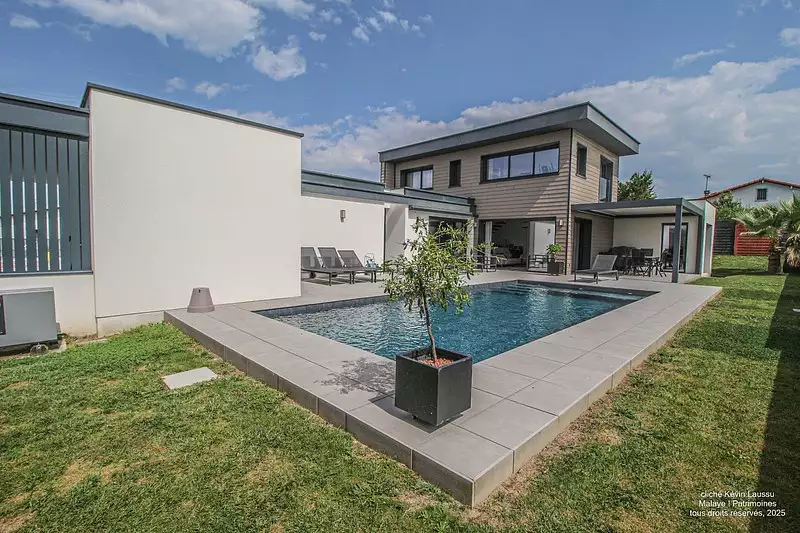 Inscrite en lotissement, cette maison adopte tous les codes de la modernité : volumes géométriques, toits terrasses, fenêtres bandeaux.
