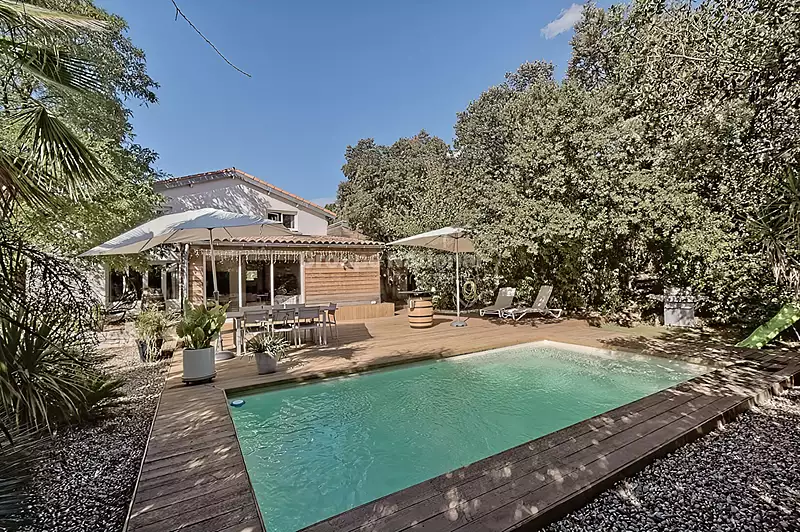 EXCLUSIVITE JUNAS Dans un environnement préservé, en pleine garrigue, au calme et sans aucun vis à vis, venez découvrir cette pépite complètement rénovée de près de 160 m2, sur une parcelle arborée de plus de 1600 m 2 avec piscine. Elle dispose d'une chambre en rez de chaussée, de deux autres à l'étage, une salle de bain et une salle d'eau et une pièce à vivre lumineuse de 68 m2. Vous vous laisserez emporter par le chant des oiseaux, la verdure et les parties de pétanque à l'ombre des chênes. Pour plus de renseignements, n'hésitez pas à nous contacter. Vidéo sur demande