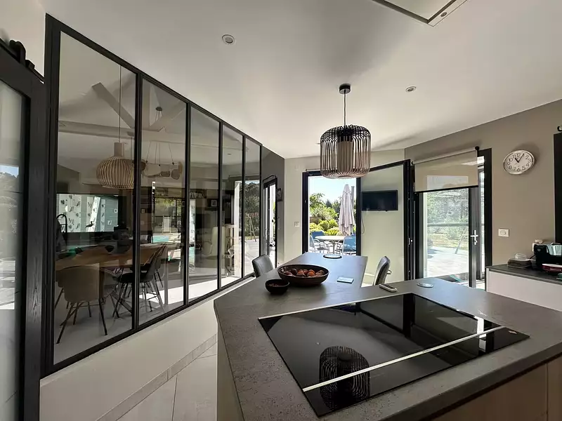 Belle maison familiale récente de plain pied d'environ 158m² sur un terrain de 1962m² exposé Sud, comprenant : Une belle pièce de vie avec cuisine équipée et arrière cuisine donnant sur le jardin paysagé et la piscine. Deux chambres avec placards, salle d'eau privative et une suite parentale avec dressing et salle d'eau.