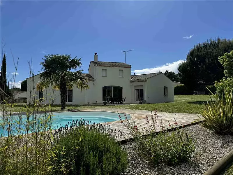 A deux pas des commerces de Jonzac, pavillon composé d'une entrée, séjour avec terrasse sans vis-à-vis, cuisine aménagée et équipée, 5 chambres, SDB, toilettes. Piscine chauffée récente avec plage et pool house. Jardin clos et grande dépendance avec possibilité d'aménager un appartement.