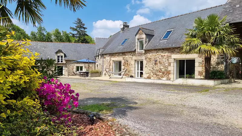 Nichée dans la paisible campagne bretonne, à seulement 5 km du village de Kergrist et à 10 minutes en voiture de la charmante ville historique de Pontivy, cette jolie longère en pierre, rénovée avec goût, allie parfaitement le charme de l'ancien et le confort moderne. Organisée autour d'une jolie cour, la maison offre des espaces de vie lumineux, spacieux et aérés, qui conservent le cachet de l'ancien tout en adoptant un style contemporain. Au rez-de-chaussée, vous trouverez une grande cuisine aménagée avec plafond haut, ouverte sur une salle à manger conviviale, puis sur un grand salon chaleureux. Un bel escalier sur mesure monte depuis la salle à manger, et un second escalier dans la salle d'eau permet d'accéder à l'autre parti. Le rez-de-chaussée comprend également une grande chambre avec son espace dressing, une salle d'eau, une buanderie avec la chaudière, et un WC séparées. A l'étage, une chambre en mezzanine surplombe la cuisine et offre un coin musique cosy, parfait pour se détendre ou télétravailler. Deux autres chambres, une seconde salle d'eau et un autre WC se trouvent aussi à l'étage, accessibles par le deuxième escalier. Le confort est assuré toute l'année grâce au chauffage central au fioul, au chauffage au sol sur la majorité du rez-de-chaussée, et aux radiateurs à l'étage. Les fenêtres sont en PVC double vitrage, pour une bonne isolation thermique et phonique. A l'extérieur, le charme continue avec plusieurs dépendances en pierre pour le rangement et deux grands hangars, tous disposés autour d'une cour centrale agréable. A l'arrière, un jardin avec pelouse permet de profiter pleinement de l'extérieur, avec en bonus une piscine hors-sol pour les beaux jours. Que vous recherchiez une maison familiale au calme, une résidence secondaire ou un bien avec du potentiel à développer, cette longère est une belle opportunité dans un cadre recherché, avec toutes les commodités à proximité. Une visite s'impose pour apprécier pleinement les volumes et l'environnement. (4.91 % honoraires TTC à la charge de l'acquéreur.) Yvonne LANG (EI) Agent Commercial - Numéro RSAC : 512 298 910 - Lorient.