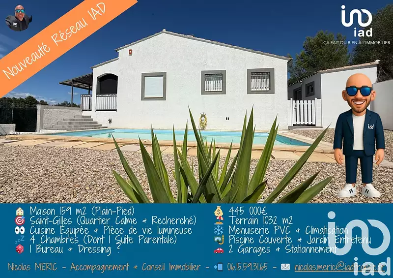 iad France - Nicolas Meric vous propose: SAINT-GILLES - Villa de 159 m2 (environ) - Terrain de 1032 m2 (environ).