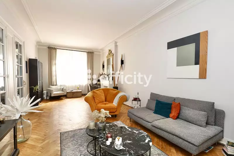 Salon-séjour lumineux avec parquet chevronné de 32m2, cheminée (tubée mais non fonctionnelle) et 3,20 m de hauteur sous plafond