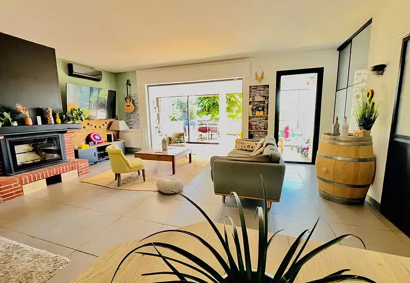 Cette pièce très lumineuse est en double exposition, d’un côté elle s’ouvre sur une terrasse en bois avec une vue sur les Pyrénées et de l’autre coté elle nous offre une seconde terrasse ouvrant sur le jardin et sur la piscine.
