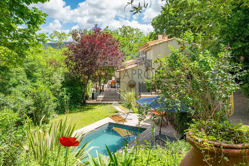 L’ensemble repose sur un terrain clos de 1 470 m2, joliment arboré et structuré en restanques avec des murs en pierres sèches et une pîscine. Un local vélo et 3 espaces de stationnement complètent les extérieurs.