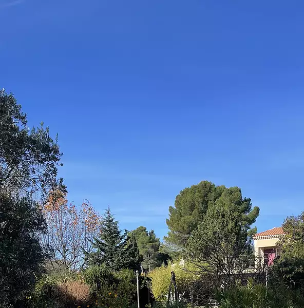 La villa provençale d'environ 160 m2 est édifiée sur un magnifique terrain de 2 600 m2, clos de haies et agrémenté d'un petit verger et de grands arbres.