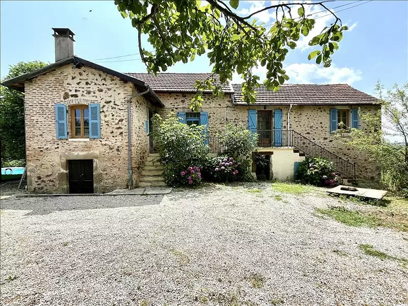 Maison en pierre sur plus de 6000 m2 de jardin, piscine, puits et grange de 40 m2. Belle pièce de vie avec cuisine ouverte et salle à manger. 5 chambres dont 2 avec salle d'eau. Environnement calme, idéal pour famille ou résidence secondaire. Double vitrage alu, poêle à bois et granulés. Rafraichissement à prévoir. À visiter. Logement à consommation énergétique excessive : classe F