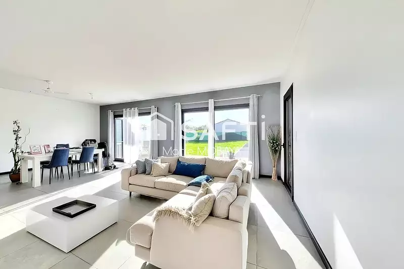 Située dans un environnement recherché, proche des commodités, cette maison contemporaine de 2016 offre un cadre de vie idéal pour une famille en quête d’espace et de confort. Édifiée sur une parcelle de 900m², elle est parfaitement adaptée au télétravail grâce à la fibre optique installée. À l’extérieur, un garage de 20m² et une dépendance de plus de 50m² équipée en eau et électricité offrent de nombreuses possibilités (studio, espace professionnel, salle de sport, atelier). Le terrain arboré sans vis-à-vis permet d’envisager la création d’une piscine. À l’intérieur, les 160m² comprennent quatre chambres dont une suite parentale avec salle d’eau, WC et dressing, deux salles de bain et deux WC indépendants. Les volumes généreux et la luminosité naturelle créent une atmosphère chaleureuse en harmonie avec l’architecture contemporaine. Grâce à ses surfaces annexes et à son organisation intérieure pensée pour le confort quotidien, ce bien permet d’envisager sereinement une évolution des besoins, notamment pour le travail à domicile. Visite virtuelle disponible sur demande.