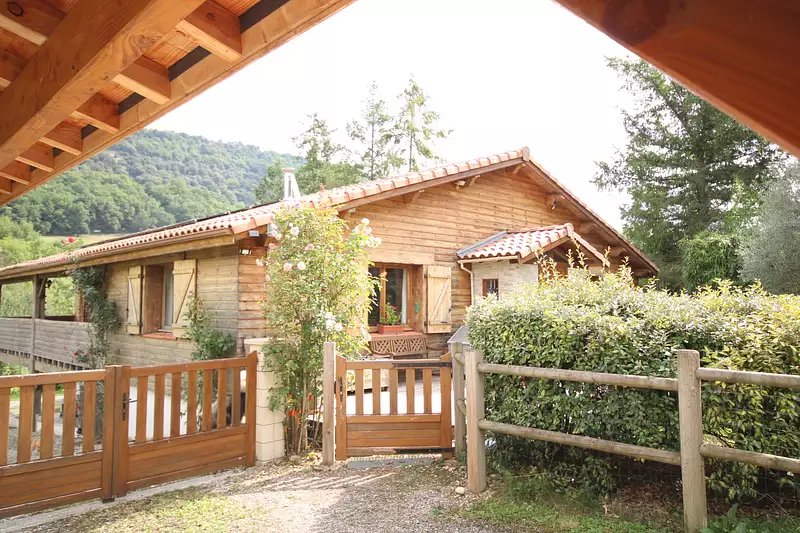 Maison indépendante type chalet, construction 2012, d’une surface habitable d’environ 160 m2 sur terrain de 3 740 m2 avec sa piscine chauffée (7x4) au sel