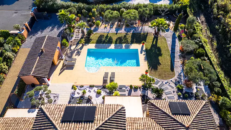 Dans un domaine résidentiel, au calme en impasse, belle villa de 165 m² offrant un espace living-cuisine de 70 m² ouvert sur un superbe jardin méditerranéen de 1510 m², 2 chambres de plain pied, cellier buanderie; à l'étage, chambre parentale avec salle de bain, bureau. Jardin paysagé, piscine chauffée de 10 m avec pool house, Garage double, Une villa confortable en état très soigné.