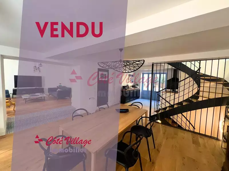 Au 1er étage on retrouve le séjour avec cuisine ouverte ainsi qu'un coin salon, le tout autour d'un bel escalier pièce maitresse de la maison, et un acces à la cour.