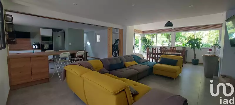 Dès l'entrée le charme opère, superbe pièce de vie lumineuse et chaleureuse de 57 m² avec cuisine ouverte toute équipée et aménagée de 2022, avec les BAIES VITREES donnant vue sur le jardin arboré !