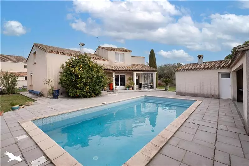 MAUGUIO CENTRE. Sur beau terrain arboré 1400 m2 au calme, sans vis à vis, avec piscine et pool house . Maison familiale de construction traditionnelle. Pièce de vie lumineuse avec véranda, 2 chambres, bureau et salle de bain au RDC. 2 chambres, salle d'eau et salle de jeu à l'étage. Garage, buanderie et atelier. TOUT A PIED
