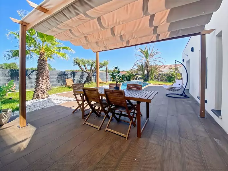 Nichée sur une parcelle entièrement clôturée, elle offre un bel espace de vie lumineux avec une cuisine ouverte et entièrement équipée, idéale pour partager des moments conviviaux en famille ou entre amis.