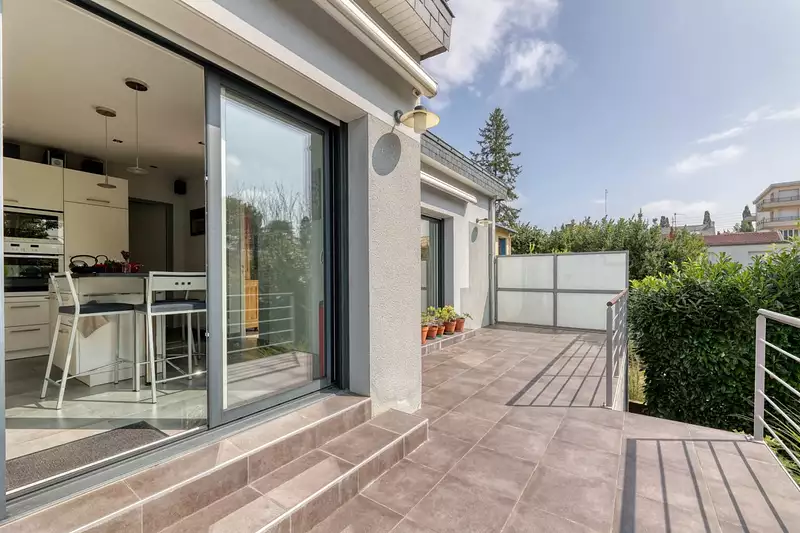 Au calme d'une petite rue du quartier Américains, maison de 1989 offrant un grand confort sur une belle parcelle de 358 m2. Au rdc : Séjour ouvrant sur grande terrasse 30 m2 et adorable jardin sud-est , cuisine A/E, ar-cuisine/buanderie, ensemble de plain-pied avec chambre + salle de bains + wc. A l'étage, grand espace mezzanine, 2 chambres, bureau, salle d'eau, wc. Gigantesque sous-sol avec cave, cave à vin, atelier. Garage.