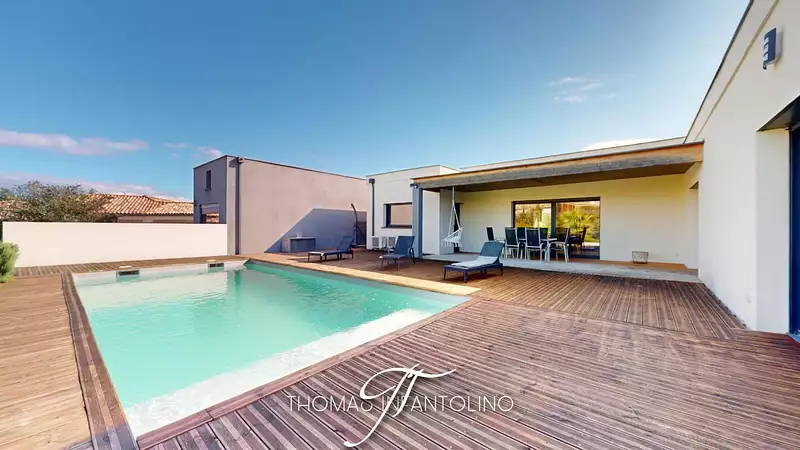 Venez découvrir cette superbe villa moderne, alliant confort, luminosité et qualité de construction. Édifiée en 2019 selon la réglementation RT 2012, elle développe environ 160 m² habitables de plain-pied, sur une parcelle entièrement close et paysagée de près de 1 000 m².
