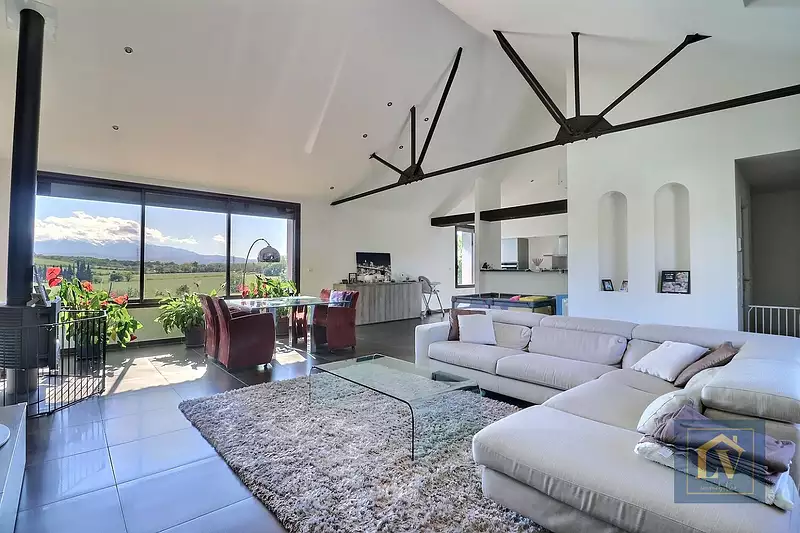 Dans un environnement privilégié, et paisible, venez découvrir cette maison coup de coeur, entièrement rénovée, alliant le charme de l'ancien et l'élégance du contemporain. Située au Mas Bresson, cette propriété de 160m² habitables séduit par son authenticité : belles pierres apparentes, poutres en acier, et matériaux de qualité soigneusement sélectionnés. Vous serez conquis par sa pièce de vie exceptionnelle de 73 m² au plafond cathédrale, baignée de lumière, avec une vue panoramique sur la campagne environnante et le Canigou. La maison offre 3 belles chambres, dont une spacieuse suite parentale de plus de 30 m², 2 grandes pièces de rangement, une salle de bains et plusieurs toilettes séparés. A l'extérieur, le charme opère également : le jardin arboré invite à la détente et aux moments conviviaux. Vous y trouverez une piscine maçonnée, un coin barbecue aménagé et un espace pour profiter du soleil et de la tranquillité des lieux. De plus la maison comprend un local de plus de 50 m² actuellement loué 415 euros/mois CC. Vous bénéficierez également de 2 places de stationnement pour vos véhicules. La maison est située dans une copropriété horizontale sécurisée, et très bien entretenue par ses 10 copropriétaires. Les charges s'élèvent à 692 euros/an (assurance du mas, électricité du portail et éclairages extérieurs, jardinier, fond de travaux) Classe Energie : B Honoraire à la charge du vendeur. Les informations sur les risques auxquels ce bien est exposé sont disponibles sur le site Géorisques. Contactez nous dès maintenant pour plus d'informations ou pour organiser une visite, LV IMMOBILIER, 04 68 73 44 75. Copropriété de 11 lots - dont 10 lots habitation. (Pas de procédure en cours). Charges annuelles : 692 euros. Elisabeth CHALOIN (EI) Agent Commercial - Numéro RSAC : - .