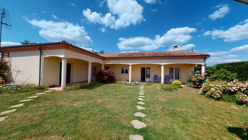 Maison d'architecte de plain pied tout confort avec cave, piscine chauffée et couverte, pool house et verger dans un village proche de Bergerac. 160m2 habitables comprenant une entrée, un séjour de 43m2, une cuisine américaine, un cellier, quatre chambres dont deux avec salle d'eau privative et une avec salle-de-bains et WC, des WC séparés et une terrasse à colonnades donnant sur le jardin, la piscine et le verger. La piscine 8m x 3,50m est couverte et a un accès direct à sa 'pool house'. Le jardin de 3686m2 environ bénéficie d'un puits et de deux cuves enterrées de récupération des eaux de pluie. Verger de 18 arbres fruitiers variés. Chaudière au gaz naturel à condensation, tout-à-l'égout, portail électrique. VISITE VIRTUELLE 3D SUR DEMANDE.