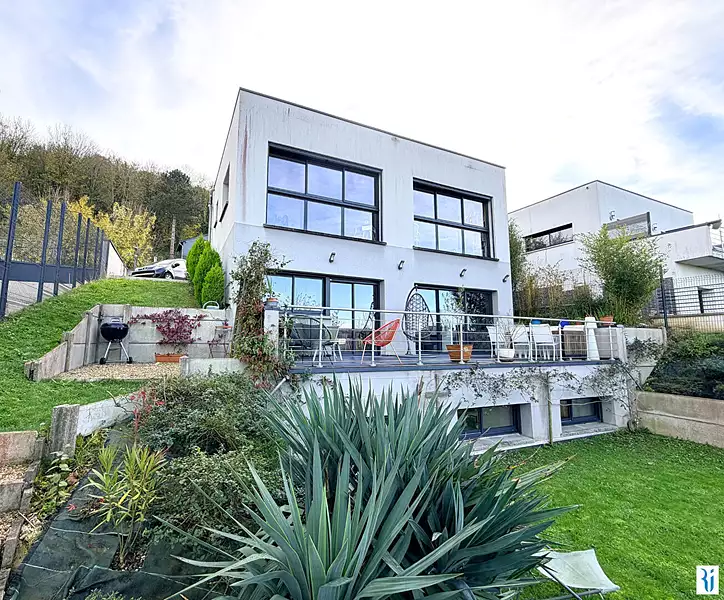 LE CABINET SAUVAGE TRANSACTION VOUS PROPOSE A LA VENTE CETTE JOLIE MAISON CONTEMPORAINE PLEINE DE CHARME DE 160 M2 HABITABLES ÉDIFIÉE EN 2014 SUR PLUS DE 900 M² DE TERRAIN ET COMPRENANT : AU REZ-DE-CHAUSSÉE: Une entrée donnant sur une jolie pièce de réception baignée de lumière de 46 m² et bénéficiant d'une incroyable vue dégagée panoramique ainsi qu'un WC. AU REZ-DE-JARDIN: Une spacieuse salle à manger avec cuisine ouverte aménagée et équipée de 41 m² donnant accès à une agréable terrasse de 26 m² ainsi qu'au jardin paysagé. Une arrière cuisine ainsi qu'un bureau / bibliothèque viennent compléter ce niveau. AU NIVEAU INFERIEUR: L'espace nuit composée d'un palier dégagement distribuant une salle de douche, un WC indépendant, une buanderie, 3 chambres dont une suite parentale avec salle de douche privative, un dressing. PRÉCISIONS: Huisseries doubles vitrages aluminium, volets roulants électriques centralisés, chauffage au sol électrique, portail électrique, un atelier de 6.50 m². NOTRE INSTINCT IMMOBILIER VOUS LA CONSEILLE POUR: Son emplacement recherché à proximité du CHU de ROUEN, environnement calme et sans vis à vis, sa vue panoramique, sa décoration soignée ainsi que son confort énergétique. A visiter rapidement ! (3.38 % honoraires TTC à la charge de l'acquéreur.)