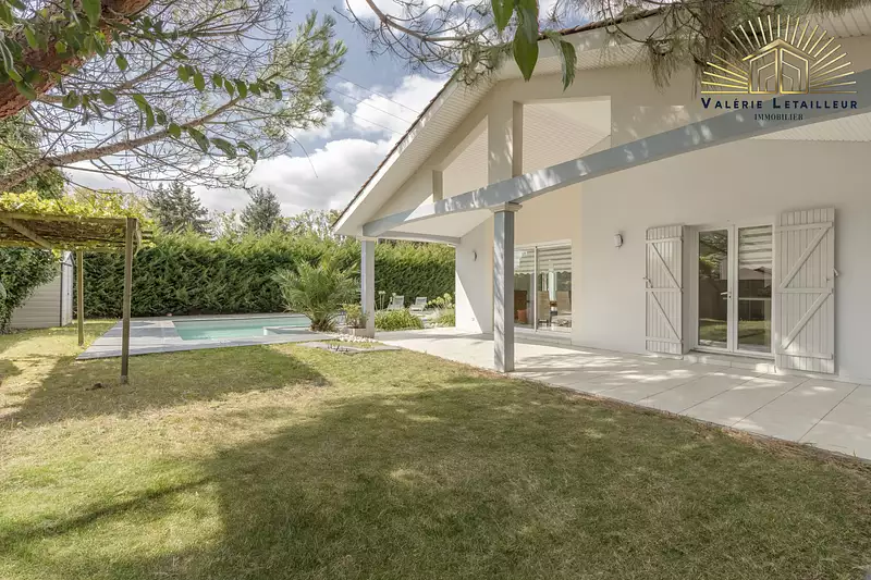 De retour dans le dégagement, une porte sur la gauche vous mènera à un grand garage, complété par une buanderie pratique. Laissez vous ensuite séduire par le jardin, où la grande terrasse s'étend devant la pièce de vie, entourée d'un espace verdoyant, mettant en valeur une piscine au design moderne, parfaite pour se rafraîchir pendant les chaudes journées d'été.