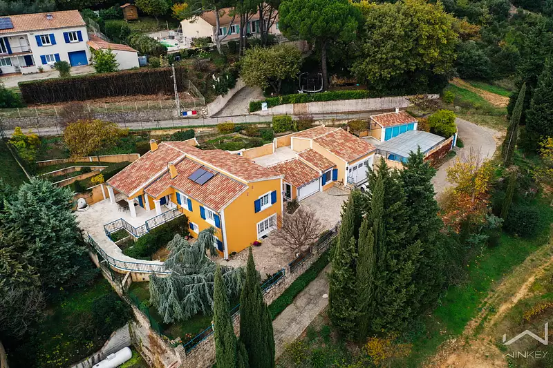 Les annexes constituent un véritable atout : un double garage dont un vaste espace de 70 m2 parfait pour accueillir un camping-car, un second garage de 30 m2, une piscine 4 × 8 m avec dôme amovible et une cuisine d’été aménagée pour profiter pleinement des beaux jours.
