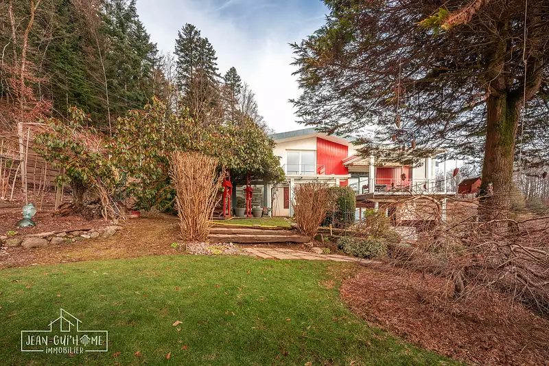 Exclusivité - Maison d'architecte des années 70 avec vue dégagée et panoramique. Terrain complètement clôturé de 1680 m2 en bordure de forêt, au calme et sans aucun vis à vis.
