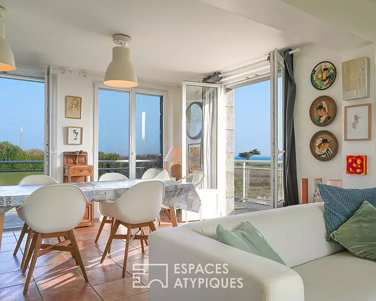 Entre ciel et mer, cette maison de caractère s'érige face à l'océan, dans un écrin de verdure préservée. Les plages s'étendent juste devant la maison, sans route à traverser. Lovée au bout d'une voie paisible de Santec, la maison profite d'un environnement naturel rare, où les éléments s'accordent avec douceur et lumière. Entièrement repensée et rénovée, cette bâtisse typique des années 70 conjugue désormais le charme d'une architecture affirmée au confort contemporain. Érigée sur une parcelle généreuse de près de 2 400 m², en zone non-submersible, elle offre un refuge lumineux, propice à un art de vivre iodé, entre calme et horizon marin. Le coeur de la maison s'organise autour d'une vaste pièce de vie traversante, baignée de lumière naturelle grâce à ses nombreuses ouvertures sur la nature et l'horizon. Ici, les ambiances se superposent avec justesse : d'un côté, un salon cosy et intimiste aux tonalités douces, ponctué de détails graphiques et de clins d'oeil marins ; de l'autre, une salle à manger chaleureuse et conviviale, largement ouverte sur l'extérieur. La cuisine, entièrement repensée, affirme un style contemporain aux accents industriels : mur de carreaux noir brillant, plan de travail en bois, îlot central avec rangements et assises. L'ensemble s'harmonise avec élégance autour d'un sol en grès cérame et terre cuite, qui structure les différents espaces tout en conservant chaleur et authenticité. Autour de cette pièce de vie, des terrasses en bois ceinturent la maison, permettant de profiter des rayons du soleil comme des embruns marins, selon l'heure et l'envie. Petit-déjeuner face à l'Est, sieste à l'ombre l'après-midi, apéritif iodé à l'Ouest : ici, la vie s'organise au rythme du ciel et de la mer. Un escalier graphique, souligné de contremarches à motifs et d'un garde-corps contemporain, signe la transition entre les niveaux et prolonge le style affirmé de cette maison repensée avec soin. L'étage accueille deux suites lumineuses, pensées comme de véritables cocons, tournés vers l'océan. La première s'ouvre sur une chambre spacieuse avec vue directe sur la grande bleue. L'espace, structuré, mais fluide, mêle coin nuit, bureau et fauteuil de lecture dans une ambiance douce et épurée. La salle d'eau, intégrée à la chambre, compose un ensemble cohérent et élégant, sans rupture. Douche à l'italienne, double vasque contemporaine, lignes sobres et finitions naturelles accompagnent la lumière du large, pour une expérience quotidienne aussi confortable qu'inspirante. La seconde suite déploie un charme singulier. Dès l'entrée, le regard est happé par la double vue sur la mer, Est et Ouest, offrant une lumière changeante, du lever jusqu'aux derniers feux du jour. La salle de bain, avec une élégante baignoire îlot, intégrée à l'espace, joue la carte du confort et de l'élégance, sans cloison superflue : un lieu pensé pour ralentir, contempler, se laisser porter par le rythme des marées. Après l'étage consacré aux suites baignées de lumière et de vues marines, le rez-de-jardin dévoile une atmosphère plus feutrée, empreinte de calme. Comme un refuge en contrebas, ouvert sur le jardin, le rez-de-jardin accueille deux chambres aux ambiances feutrées, pensées pour prolonger les moments de quiétude ou accueillir famille et amis en toute indépendance. Chacune dispose d'un accès direct à l'extérieur, pour une vie dedans-dehors au fil des saisons. Une salle d'eau indépendante complète ce niveau avec fonctionnalité et élégance. Une buanderie vient parfaire le confort quotidien. Un vaste jardin entoure la maison, assurant calme et sécurité pour les enfants. L'accès aux plages se fait à pied par le sentier des dunes, menant notamment à la plage du Billou, toute proche : la plage des familles, vivante et animée, où les pêcheurs amateurs de Santec mettent régulièrement leur embarcation à l'eau. . Pour les amateurs de glisse, la plage du Dossen vous attend avec ses vagues, prisée des kiteurs et surfeurs. C'est un lieu où l'on pose ses valises pour savourer pleinement un quotidien iodé : baignades, activités nautiques, balades sur le GR 34 ou simples contemplations du large deviennent un art de vivre à part entière. Caractéristiques techniques : Reliée au tout-à-l'égout, fibre. Sandrine GAVESTON (EI) Agent Commercial - Numéro RSAC : 852 199 579 - BREST.