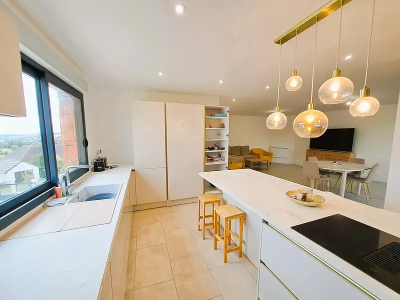 AU RDC : entrée, cuisine aménagée équipée d'environ 23 m2 ouverte sur un vaste salon - salle à manger de 33 m2 avec une grande baie vitrée, quatre belles chambres dont une suite parentale de 25 m2 avec dressing et salle d'eau (à installer), bureau, buanderie, cellier, salle de bains (avec baignoire et douche, à installer), dégagements, wc avec lave-mains. Sous-sol total avec garage et porte automatique. Chauffage électrique. Double vitrage alu. Volets électriques.