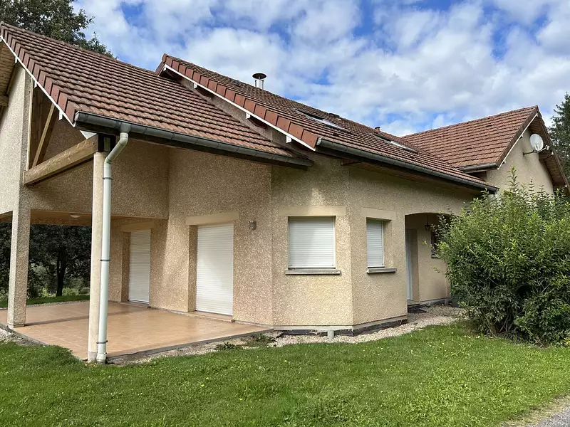 A découvrir maison d'architecte axe st die alsace a 17 minutes de st die et à 10 minutes de l'alsace magnifique maison d'architecte construite en 2005 sur un terrain de 2243 m2 avec vue exceptionnelle sans aucun vis à vis. comprenant: un sous sol complet avec cave, garage 2 voitures, buanderie, dégagement, cellier. au rdc entrée, cuisine ouverte équipée donnant sur une terrasse couverte, spacieux salon séjour, 3 chambres, dressing, salle de bain et wc. a l'étage mezzanine, bureau, une chambre, salle d'eau et wc. equipements: alarme, chauffage au sol par géothermie, insert, installation système aspiration centralisée. a découvrir sans tarder -
