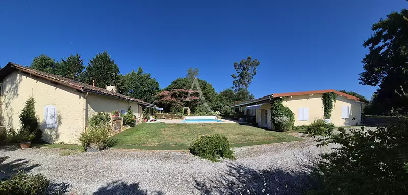 A 8 minutes de Villeneuve de Marsan Un havre de paix où le charme opère dès le premier regard Nichée dans un écrin de verdure, cette propriété respire l'harmonie et la sérénité. Dès l'entrée, le ton est donné : volumes chaleureux, matériaux authentiques, atmosphère conviviale. Le coeur de la maison s'organise autour d'un espace de vie sublimé par une cheminée, véritable invitation à la détente. La salle à manger, prolongée par une cuisine ouverte et climatisée, s'illumine grâce à de grandes ouvertures qui effacent les frontières entre intérieur et extérieur, révélant une vue imprenable sur le jardin et la piscine. Un lieu de vie baigné de lumière, pensé pour vivre au rythme des saisons. Les pièces techniques ? cellier, WC indépendant ? se fondent ici dans une organisation fluide et cohérente, facilitant le quotidien sans rompre l'harmonie des volumes. Discrètement en retrait, la suite parentale offre intimité et confort avec sa salle de bain attenante et son dressing élégant. A l'étage, deux chambres cosy, dont une mansardée, accueillent famille ou invités, avec climatisation pour un confort optimal, une salle d'eau fraîchement aménagée, et des toilettes séparées. Un atout rare : une dépendance aménagée en deux logements indépendants, un T2 et un T3, parfaits pour recevoir ou envisager un projet locatif. Un garage, un carport, un abri supplémentaire complètent les prestations extérieures. Le tout est posé sur un terrain de près de deux hectares, soigneusement arboré, avec une petite forêt privée, à l'abri des regards et du tumulte. Un cadre de vie exceptionnel, préservé, idéal pour ceux qui rêvent d'espace, de nature, et de tranquillité, sans pour autant renoncer au confort. (4.41 % honoraires TTC à la charge de l'acquéreur.)