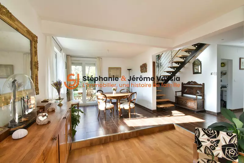 Au rez-de-chaussée, vous serez séduits par un vaste séjour baigné de lumière, ouvert sur une agréable terrasse en bois, parfait pour recevoir famille et amis. La cuisine équipée s'accompagne d'une arrière-cuisine fonctionnelle communiquant directement avec le garage, un vrai plus au quotidien.