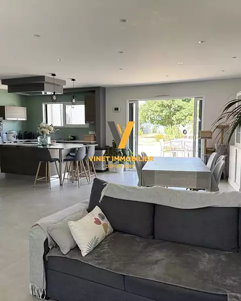 En village, vue dégagée pour ce vaste plain pied récent aux prestations soignées de plus de 160 m2 hab. : cuisine équipée ouverte sur salon séjour avec poêle à granules donnant sur terrasse et jardin , trois chambres, salle de bain, bureau, salle de jeux, cellier, deux toilettes, suite parentale ou partie à recevoir (possibilité de revenus locatifs) comprenant : dressing, chambre avec salle d'eau et toilettes avec accès indépendant. Grand garage de 45 m2. Très beau jardin de plus de 5000 m2 avec espace verger, potager, terrain de boules... Ouvert à l'inter-agence.