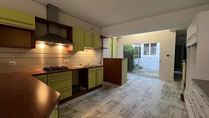 Autun Maison de ville de 163 m², 7 pièces, 5 chambres, séjour traversant de 53 m² avec cuisine ouverte et aménagée donnant dans une petite courette de plein-pied de 16 m². Chauffage central au Gaz.