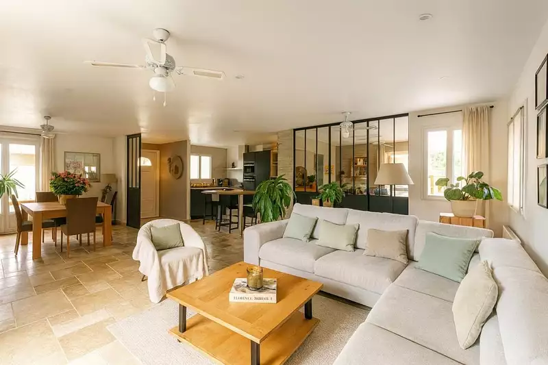 En rez-de-jardin, vous serez séduits par une vaste pièce de vie d'environ 40 m², baignée de lumière, avec cheminée et cuisine américaine équipée — un véritable espace convivial où il fait bon se retrouver.