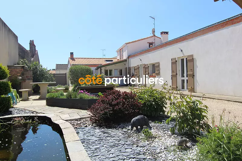 Maison de 163m² sur une parcelle de 1786m² située dans la commune de Grues à 10 minutes des plages de la Faute-sur-Mer. Cette maison se compose d'une entrée, un séjour, deux cuisines, trois chambres, deux salles de douche avec WC, deux buanderies et une chaufferie. L'extérieur bénéficie d'un double garage de 62m² entièrement carrelé avec portes motorisées attenant à la maison, un atelier de 19m² , un deuxième garage de 29m² , une cour aménagée et une étendue de pelouse arborée entièrement close et sans vis à vis. La maison est reliée au réseau du tout à l'égout et son système de chauffage est une chaudière à fioul, le séjour est équipé d'un poêle à bois en complément. (3.26 % honoraires TTC à la charge de l'acquéreur.)
