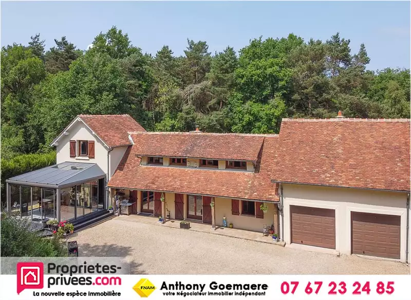 A l' extérieur, 2 garages, une marre, un hangar l' ensemble sur une parcelle boisée d' environ 9600 m².