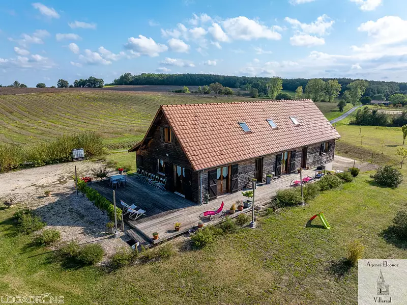 Dans un écrin de verdure et aux vues panoramiques cette maison à ossature bois saura vous ravir. Sise à la sorti d'un petit bourg tranquille entre le village médiéval d'Issigeac et la Bastide de Villeréal (Plus Beaux Villages de France) cette maison tout confort de 2013 dispose d'un séjour, d'une cuisine de type professionnel, d'une chambre, d'une salle d'eau ainsi que d'une grande pièce d'accueil et WC séparé en rez-de-chaussée ainsi que de 4 pièces à l'étage dont 2 véritables chambres et un grenier. Le tout sur un spacieux sous sol intégral avec accès voiture. Construction de qualité et DPE en C/A, chauffage bois avec appoint électrique. Idéal pour grande famille ou activité professionnel cette propriété dispose également d'un grand terrain de plus d'un hectare utile.