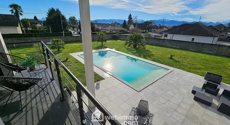 À l'étage, deux chambres supplémentaires, une deuxième salle d'eau et une suite parentale remarquable composent la partie nuit. La suite se distingue par sa superbe salle d'eau et son accès à un balcon, offrant une vue directe sur la piscine et sur les Pyrénées : un espace intime et élégant, parfaitement mis en valeur.