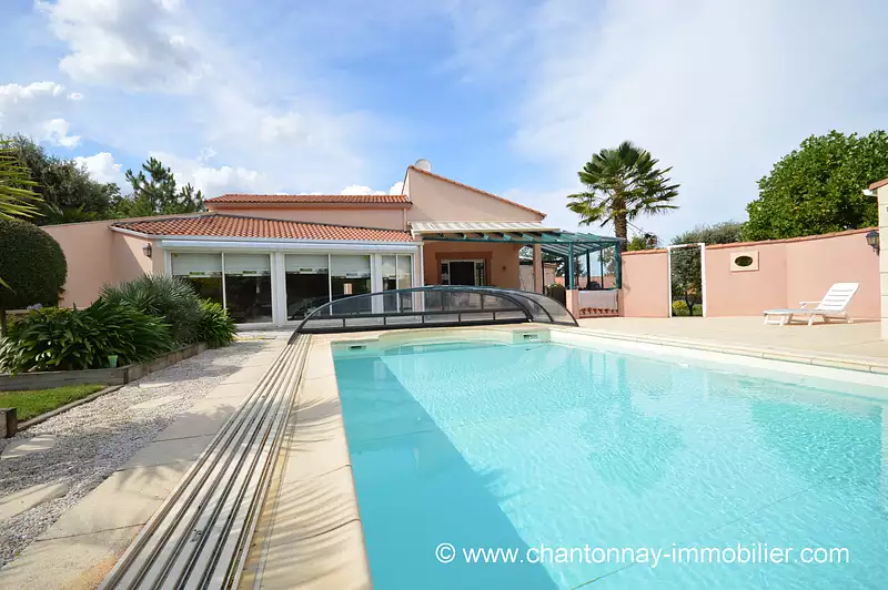 Rare ! A CHANTONNAY. Très belle propriété dans quartier calme et prisé, proche centre ville. Prestations et matériaux de qualité pour cette maison contemporaine lumineuse et confortable, offrant de beaux volumes. Elle est composée au rez-de-chaussée, d'un grand hall d'entrée, d'un salon-séjour d'env. 52m2, d'une cuisine aménagée et équipée, de trois chambres avec salles d'eau privatives, 2 wc, une lingerie et un garage. Au sous-sol : Deuxième garage, cellier et cave. Un vaste garage pour camping-car avec sanitaire et point d'eau (possibilité logement annexe). Un pool-house (pièce de vie annexe) avec SDE et wc, idéal pour logement type studio. Un vaste garage-atelier + local technique piscine. Une très belle piscine couverte. Un abris de jardin. 2 terrasses dont une semi-fermée. Un très agréable terrain paysagé entièrement clos et sans vis-à-vis agrémenté d'un étang, le tout sur environ 6 500m2.