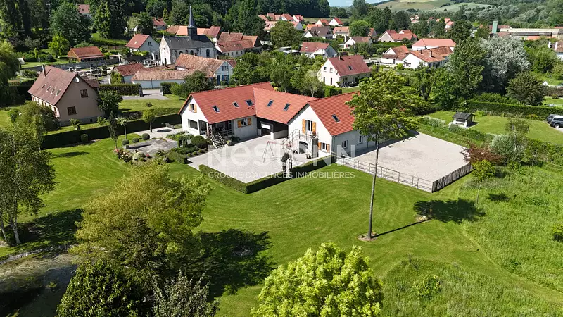 Nichée au coeur d'un cadre naturel préservé à seulement quelques minutes de Montreuil sur Mer, cette propriété unique allie charme, confort et potentiel. Sur la commune d'Estréelles, elle offre un havre de paix rare, à la fois proche des commodités et en pleine nature. La maison principale bénéficie d'une vie de plain-pied et baignée de lumière, elle s'organise autour d'un hall d'entrée central desservant : Un vaste séjour cathédrale de 50 m² avec salon et salle à manger donnant sur une terrasse et pergola avec vue magnifique sur le parc, Une cuisine semi-ouverte, équipée et fonctionnelle. Un cellier/buanderie avec toilettes, Une chambre (actuellement exploitée en dressing), Une salle de bain avec baignoire d'angle, douche et meuble vasque. A l'étage : Pallier en mezzanine, trois grandes chambres (18 m² -19 m² et12 m² habitables ; surfaces supplémentaires au sol) et une pièce d'eau. La dépendance (bâtiment agricole) est idéale pour un projet professionnel, artisanal ou touristique, ce bâtiment en excellent état propose : Une grande pièce de 80 m² au rez-de-chaussée, avec menuiseries double vitrage, Un étage de 170 m² au sol avec 5 velux et porte-fenêtre (accès indépendant possible), Raccords eau/électricité prévus, Un préau couvert pour stationner plusieurs véhicules, Un garage séparé et un chenil complètent les dépendances. Un parc paysager d'exception Ce véritable écrin de verdure a été pensé et aménagé autour d'un étang alimenté par des sources naturelles. Arbres et arbustes rares, promenades aménagées, pont charmant traversant l'étang. Les abords sont parfaitement entretenus, assurant une protection optimale de l'habitation (sur vide sanitaire) contre les aléas climatiques. Ce que nous aimons : Qualité de construction Volumes généreux et grande luminosité, Potentiel professionnel ou touristique, Environnement naturel exceptionnel, sans vis-à-vis, Ce bien vous intéresse ? N'attendez plus et contactez Jonathan Lepretre au 07.85.84.17.10 ou l'agence NESTENN Cucq-Le Touquet au 03.91.89.09.76. Les honoraires sont à la charge du vendeur Jonathan LEPRETRE (EI) Agent Commercial - Numéro RSAC : 903925899 - Boulogne sur mer.