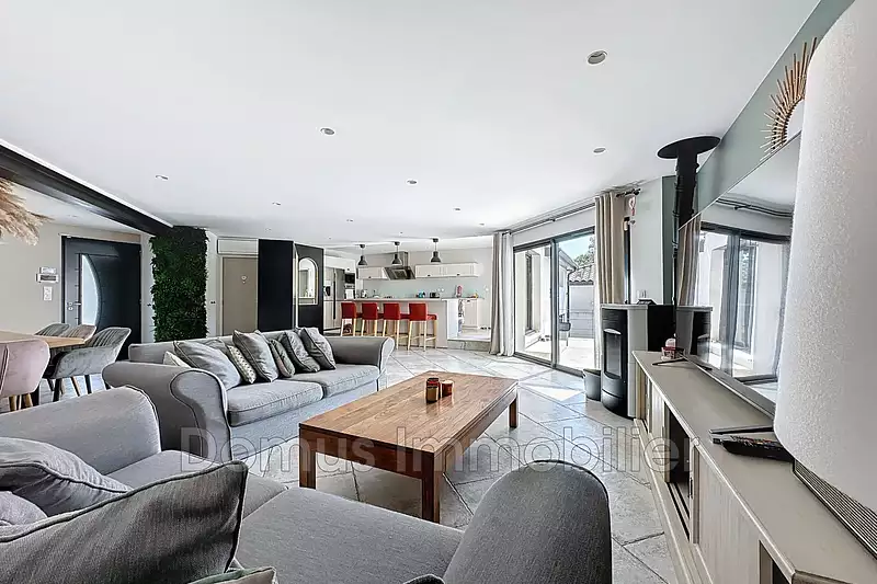 La cuisine équipée, baignée de lumière grâce aux grandes baies vitrées, s'ouvre sur un salon / salle à manger spacieux équipé d'un poêle à granulés pour le confort et d'une cheminée à l'éthanol design.