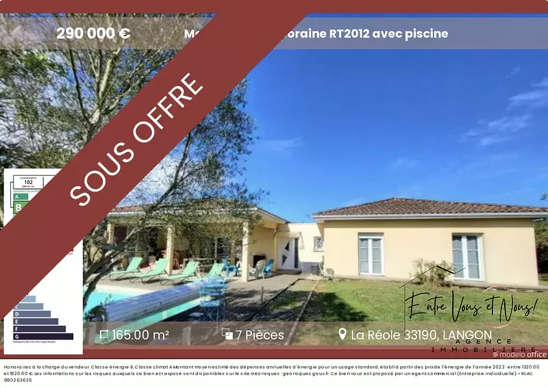 Honoraires à la charge du vendeur. Classe énergie B, Classe climat A Montant moyen estimé des dépenses annuelles d'énergie pour un usage standard, établi à partir des prix de l'énergie de l'année 2023 : entre 1320.00 et 1820.00 €. Les informations sur les risques auxquels ce bien est exposé sont disponibles sur le site Géorisques : georisques.gouv.fr.