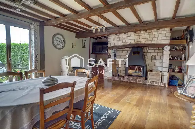 Volumes généreux, poutres apparentes, cheminée en pierre blanche.
