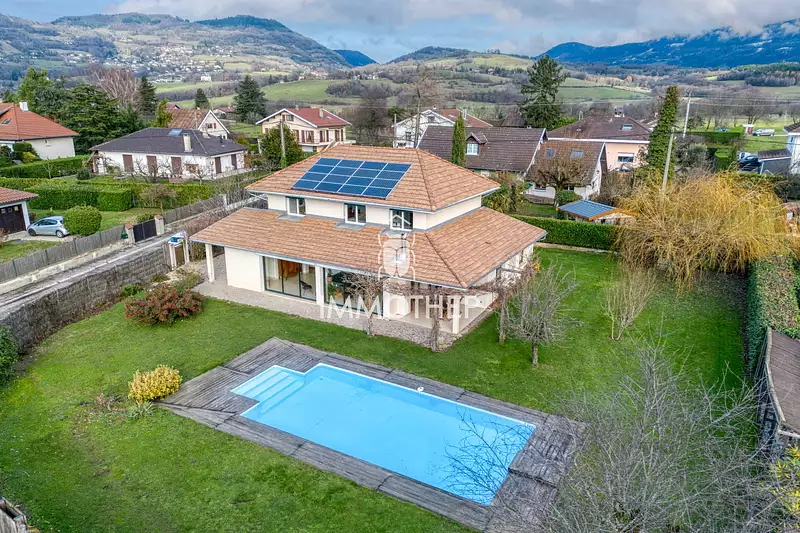 L'entrée s'ouvre sur une vaste pièce de vie lumineuse, parfaite pour les moments en famille; un poêle diffuse une douce chaleur pour les soirées d'hiver. Sur ce niveau, vous trouverez une chambre, une buanderie, un coin télévision et l'accès au garage. La cuisine indépendante s'ouvre sur la terrasse, idéale pour les repas d'été à l'abri de la glycine, avec une belle vue sur la piscine. Profitez d'un magnifique jardin, parfaitement entretenu, avec les montagnes en toile de fond.A l'étage, l'espace nuit se compose de 4 chambres, dont une suite parentale avec sa salle d'eau et son dressing.