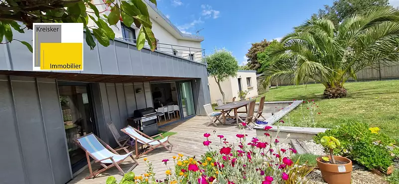 Bretagne, baie de Morlaix, Carantec ses plages , son golf, sa douceur de vivre ; vente maison de 2005 avec extension de 2011, comprenant entrée, séjour - cuisine aménagée et équipée donnant sur la terrasse bois et le jardin exposés Sud, salon détente avec cheminée insert double face ; habitable de plain pied avec chambre et salle d'eau privative, wc, cellier, garage attenant. A l'étage, une mezzanine desservant 4 chambres dont une avec dressing, salle de bain et douche, balcon - terrasse. A découvrir. (4.92 % honoraires TTC à la charge de l'acquéreur.)