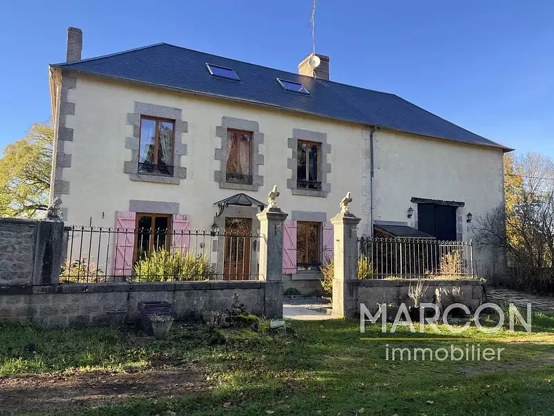 Secteur Crocq. Réf: 88781. Très belle propriété sur 1 ha 30 de terrain, sans vis à vis, comprenant en rez-de-chaussée: cuisine équipée, salon, salle à manger, véranda, buanderie. 1er étage: 3 chambres, salle de bains-wc, salle d'eau-wc, wc. 2ème étage: 2 chambres mansardées. Dépendance attenante avec garage, écurie et chaufferie. Chauffage central fuel/bois. Très bel emplacement. Prix: 275 600 euros (honoraires agence inclus de 6% à la charge de l'acquéreur).