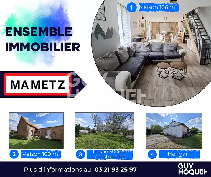 A vendre - Ensemble immobilier à Mametz Opportunité rare proche d'Aire-sur-la-Lys ! Cet ensemble immobilier sur près de 5000m² offre un fort potentiel d'aménagement pour un investissement locatif, la construction de logements neufs, des gîtes ou une activité professionnelle. Le bien comprend : - Une maison individuelle de 166 m² avec 4 chambres, grands espaces et quelques travaux à terminer. - Une maison rénovée de plain-pied de 109 m² avec 2 chambres - Un hangar de 115 m², un garage de 80 m² et une grange de 160 m² (à rénover) - Plus de 3200 m² de terrain constructible (non viabilisé) facilement accessible et divisible pour plusieurs projets. Plus d'informations sur notre site saint-omer.guy-hoquet Cet ensemble immobilier offre une multiplicité de possibilités, que ce soit pour la création de logements ou un projet professionnel. Pour plus d'informations ou pour organiser une visite, contactez-nous dès maintenant. Les informations sur les risques auxquels ce bien est exposé sont disponibles sur le site Géorisques : www.georisques.gouv.fr. Marion DUQUENNE (EI) Agent Commercial - Numéro RSAC : 948108683 - Boulogne sur Mer.